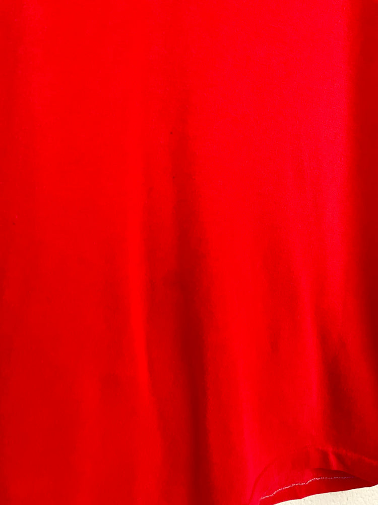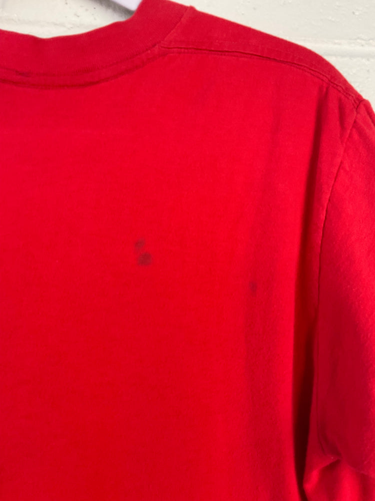 Good. Lightly faded and worn, and 1 inch of the neck band is separating from the shirt, just on the front of it (back stitching is still intact). Three black stains on right upper back, faint stains on lower front.