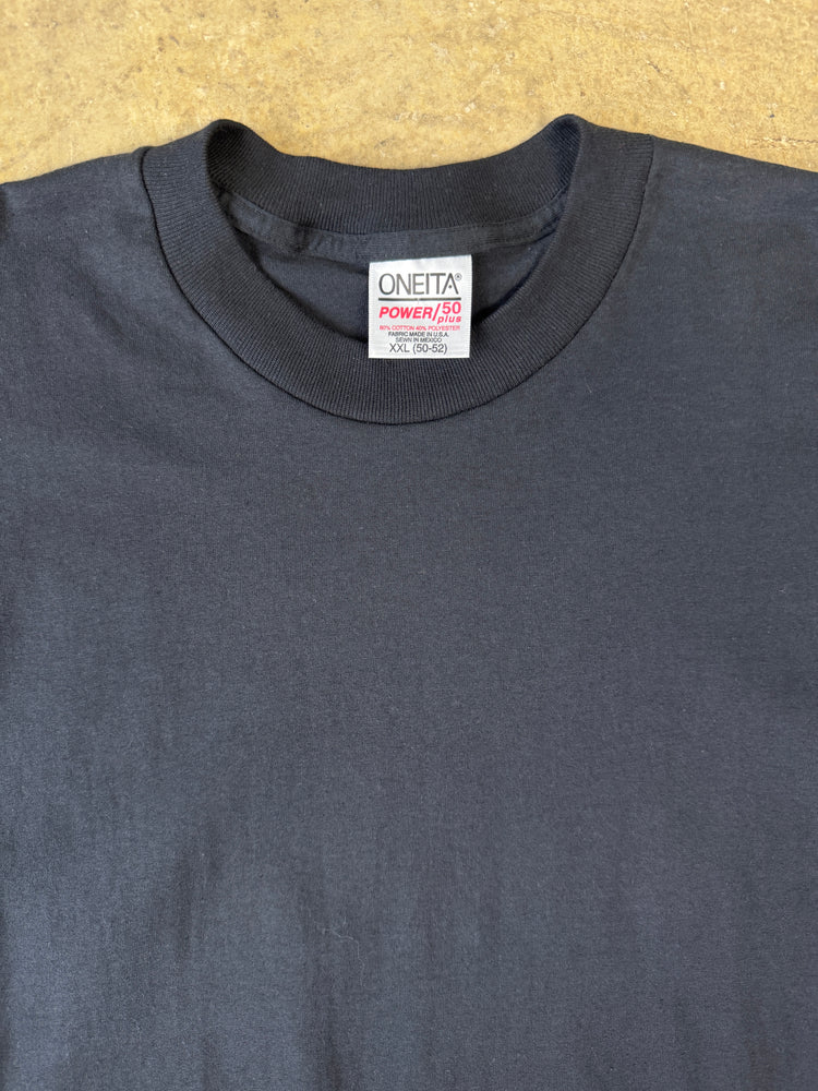Classic Blank Black T-Shirt with Oneita Power 50 Plus tag and single stitch hem. Fabric made in USA, sewn in Mexico.
